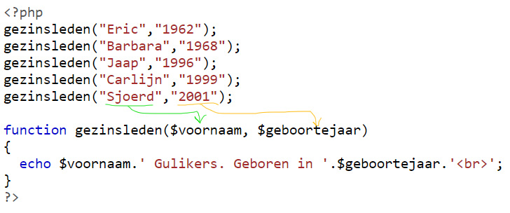 De vraag is nu hoe je data meegeeft aan die variabelen die dienst doen als parameters in een functie. Dat kan door ze mee te geven als waarden als je de functie aanroept. Hieronder zien je daarvan een voorbeeld: